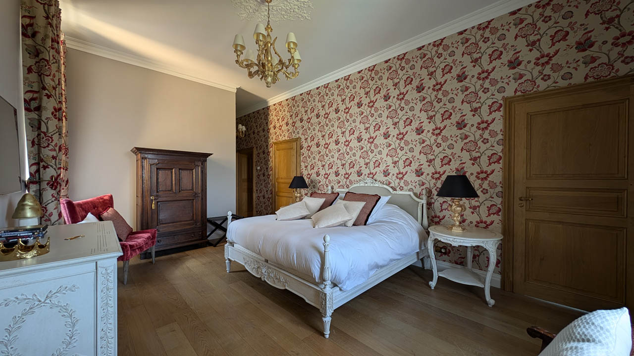 Entrez dans la Suite Cardinal, où l'élégance classique française rencontre le confort moderne. Avec son papier peint floral richement détaillé, ses meubles anciens en bois blanc et ses textiles luxueux, cette chambre de 32 m² exhale une atmosphère raffinée mais chaleureuse. La suite est ornée d'un grand lit et de sièges confortables, parfaits pour se détendre. Les clients peuvent profiter de la vue sereine depuis la fenêtre, encadrée par des rideaux lourds qui complètent les tons chauds de la pièce. La Suite Cardinal offre une expérience véritablement immersive dans le charme historique du Château de Berg, faisant de chaque séjour une retraite inoubliable.