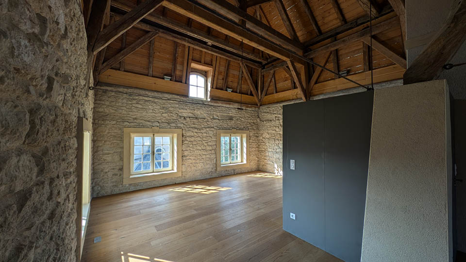 Au dernier niveau du château, les combles aménagés offrent un espace unique baigné de lumière naturelle. Ce loft spacieux avec poutres apparentes révèle une vue panoramique sur la vallée de la Moselle, le jardin avec sa piscine, et l'église pittoresque de la campagne mosellane.