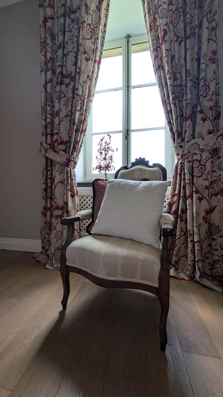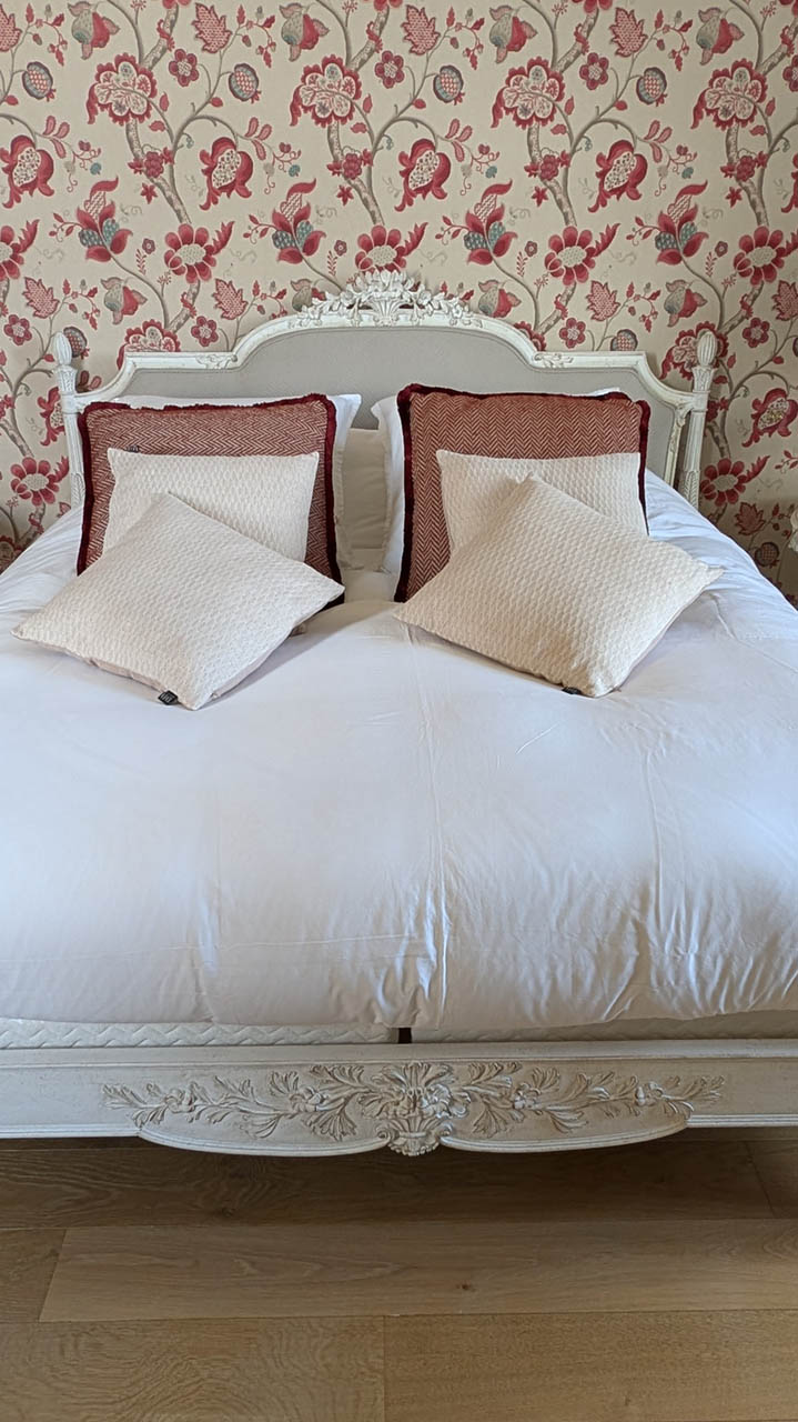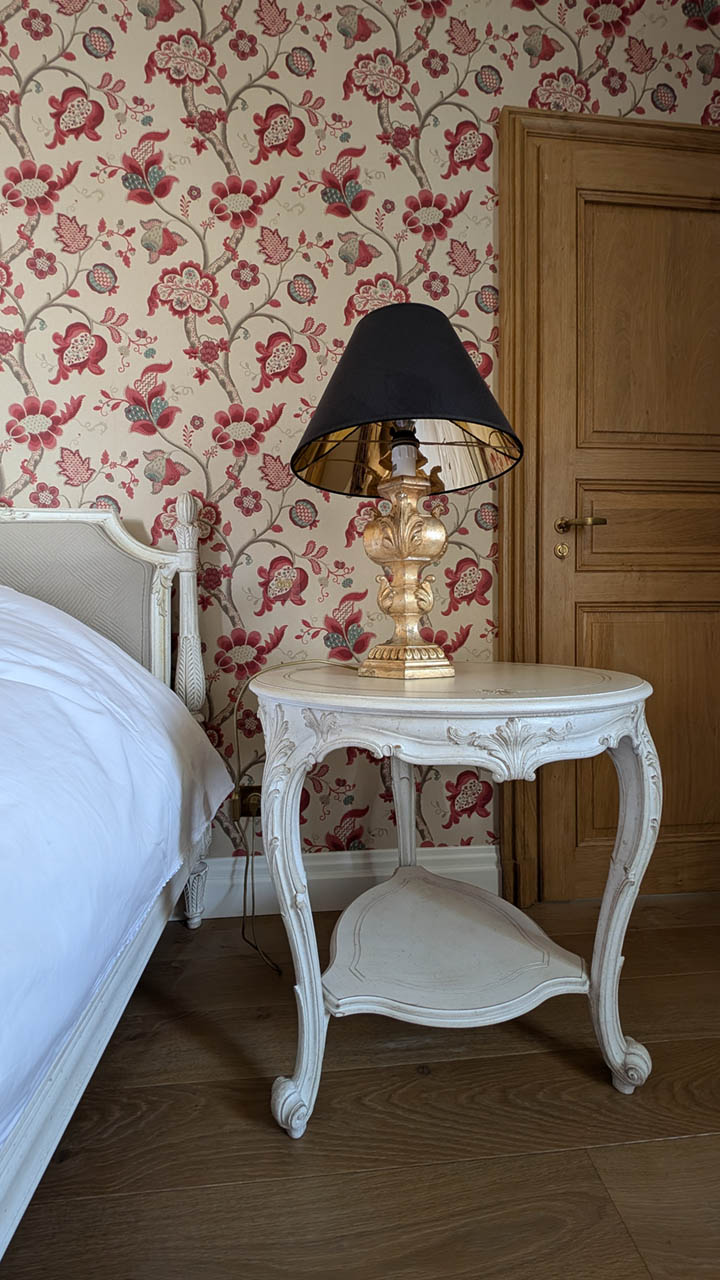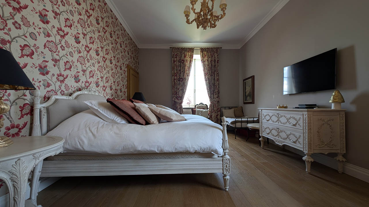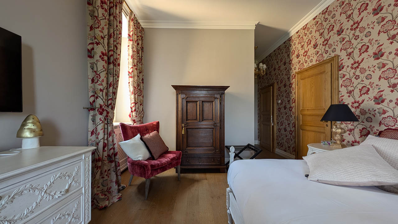 Entrez dans la Suite Cardinal, où l'élégance classique française rencontre le confort moderne. Avec son papier peint floral richement détaillé, ses meubles anciens en bois blanc et ses textiles luxueux, cette chambre de 32 m² exhale une atmosphère raffinée mais chaleureuse. La suite est ornée d'un grand lit et de sièges confortables, parfaits pour se détendre. Les clients peuvent profiter de la vue sereine depuis la fenêtre, encadrée par des rideaux lourds qui complètent les tons chauds de la pièce. La Suite Cardinal offre une expérience véritablement immersive dans le charme historique du Château de Berg, faisant de chaque séjour une retraite inoubliable.