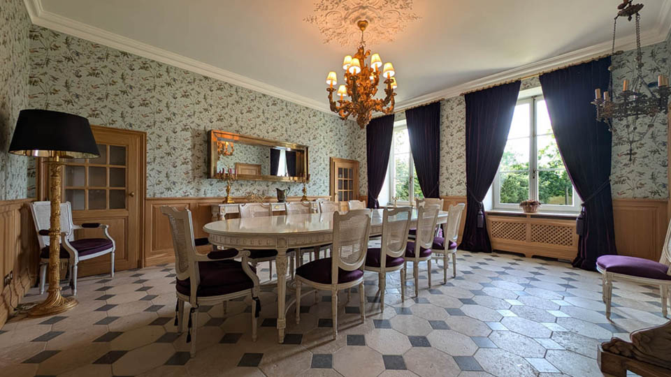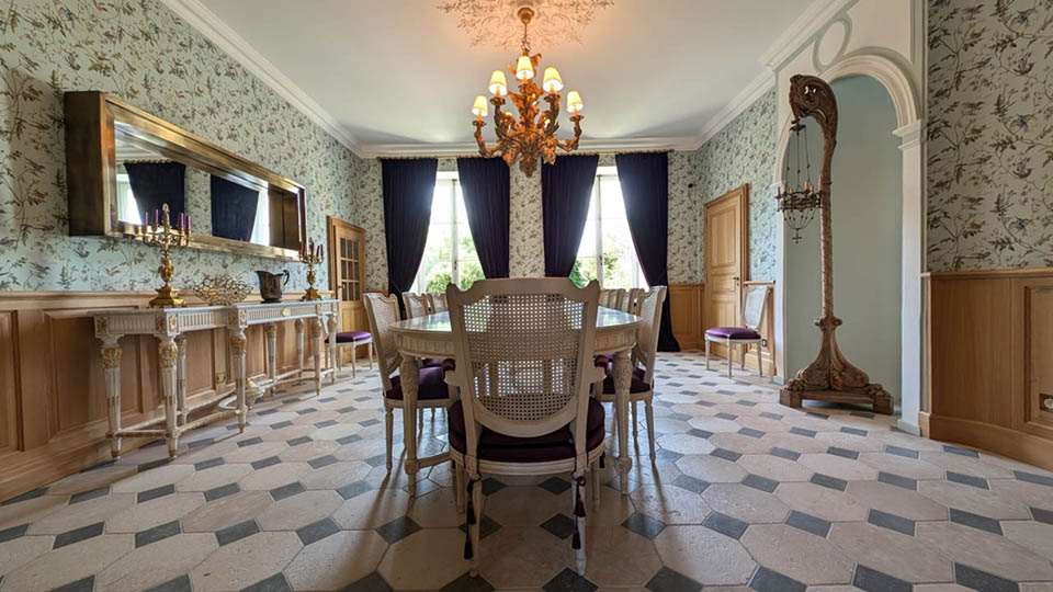 Organisez des dîners intimes dans la salle à manger ornée, avec sa grande table et sa décoration charmante offrant un cadre idéal.